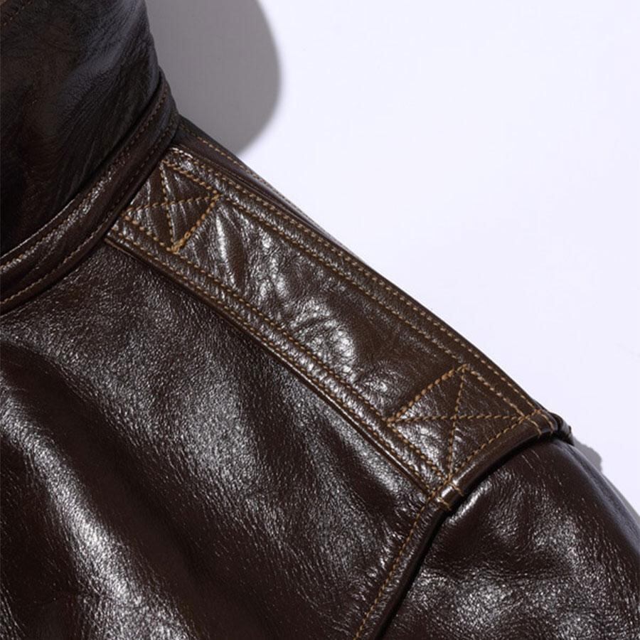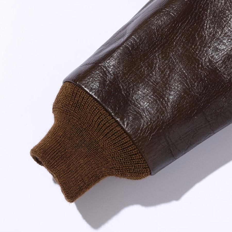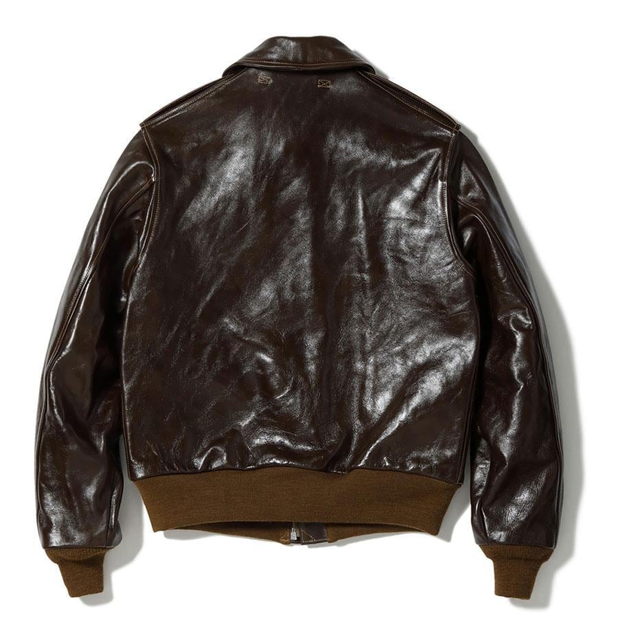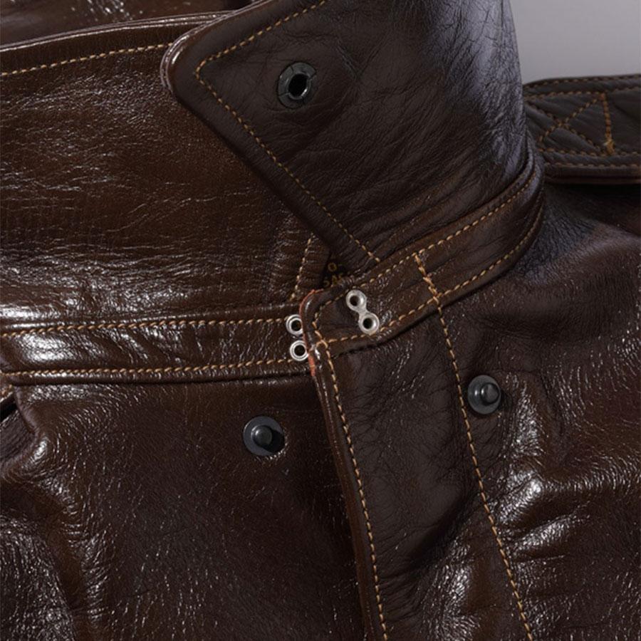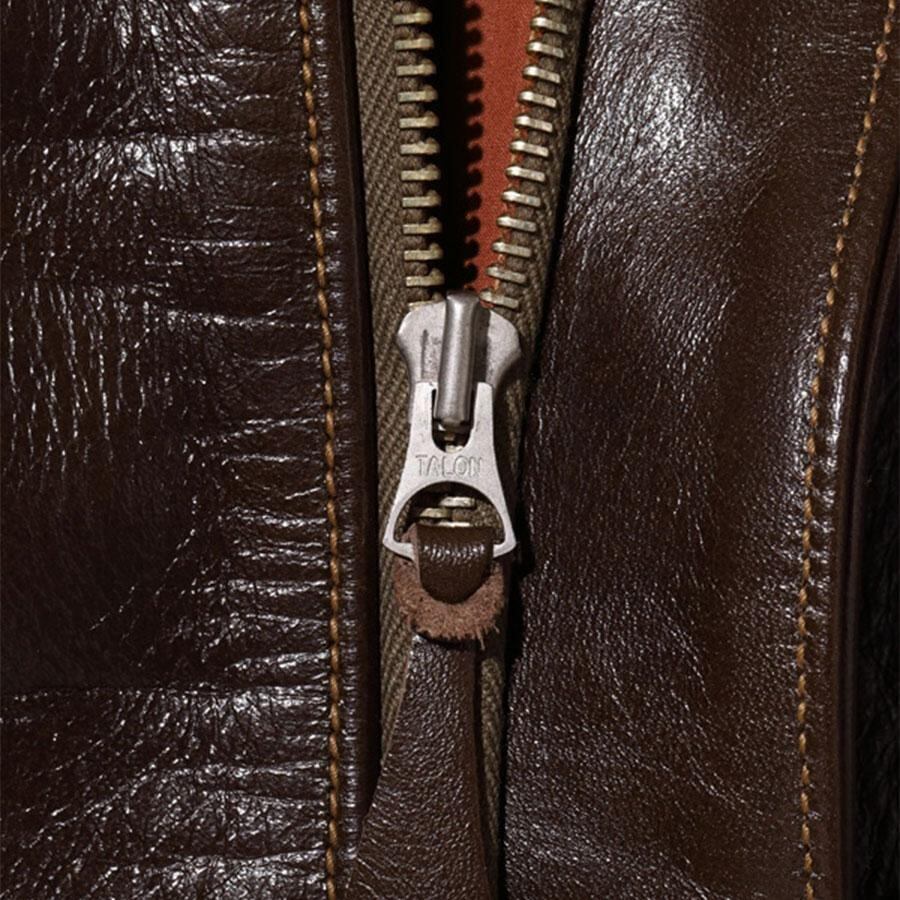 A-2のコントラクターでも生産性のある工場背景を持っていたラフウェア社。計5回の納入を果たした同社のこのモデルは1942年契約の4番目にあたる。米陸軍航空隊は1942年の途中から“プロパティー・エアフォース”の表記を義務付けしたため、2枚のラベルを重ねて縫い付ける、所謂2段ラベルが特徴となっている。イタリア産の原皮を樹皮から抽出したタンニン槽に漬け置きし、濃度を変えながらゆっくりと時間を懸けて鞣されている。多少の色むらがあるのは手作業ならではの証でアニリン染料で仕上げた革は、ラッカー仕上げと比較すると色に透明感があるため、使用感や経年変化で革自体に表情が出やすいのが特徴。渋液と染み込んだ染料が革の奥底に宿るこのジャケットは着用毎に表情が磨かれる。
