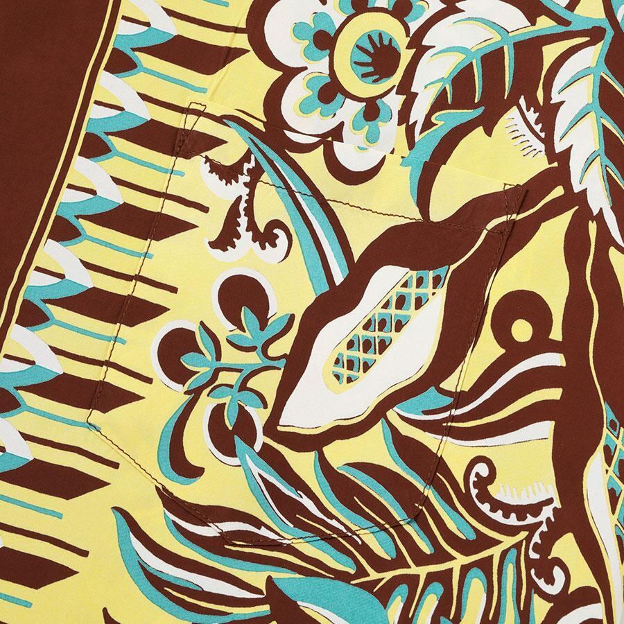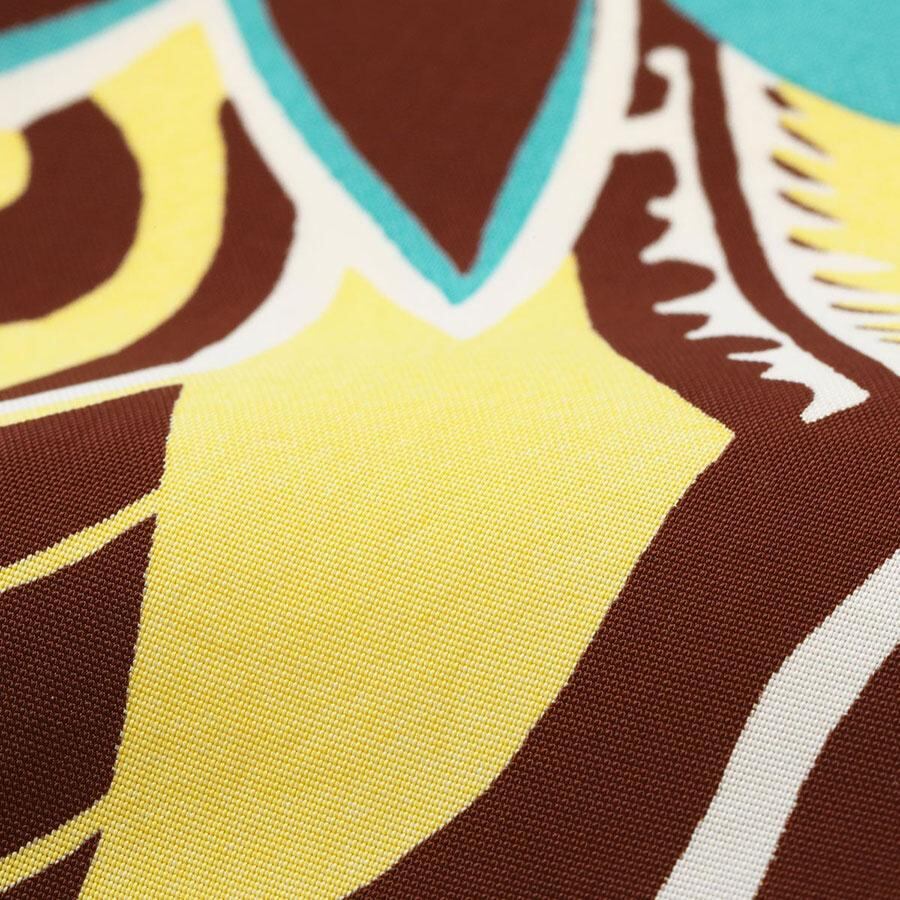 生地全体の中央部分はオールオーバー・パターンでデザインされ、後身頃の部分に使われている。生地の両端の部分には無地場を作り、前立て部分や襟、袖口などに使用。箇所によって柄と無地場がアクセントになるように計算された一枚。