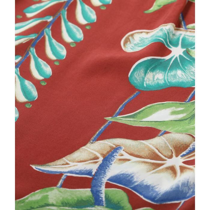 幻想的な雰囲気と特別な存在感を持つこのアンスリウムのボーダー・デザインは、カメハメハ・ガーメント社が手掛けた名作。通常は3〜5色ほどで構成される抜染プリントにおいて、本作は他に類を見ない12色もの版で染め抜く。多色の抜染を駆使して生み出されるリアルで鮮やかな仕上がりは、他のデザインとは一線を画する。