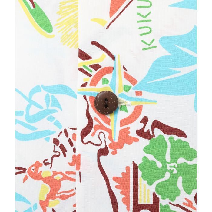 幻想的な雰囲気と特別な存在感を持つこのアンスリウムのボーダー・デザインは、カメハメハ・ガーメント社が手掛けた名作。通常は3〜5色ほどで構成される抜染プリントにおいて、本作は他に類を見ない12色もの版で染め抜く。多色の抜染を駆使して生み出されるリアルで鮮やかな仕上がりは、他のデザインとは一線を画する。