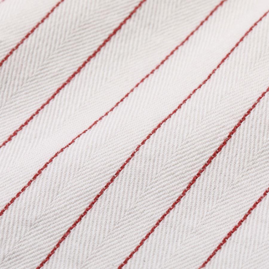 1950〜60年代にアメリカの大手飲料メーカーでユニフォームとして使用されていた「コークストライプ」ワークシャツを再現。重量のあるボトルの運搬にも耐えうるタフな生地が特徴で、シュガーケーンが所有するデッドストック(新品状態のまま発見されたヴィンテージ)を分析し、ヘリンボーンツイル生地を旧式の力織機を使って織り上げている。