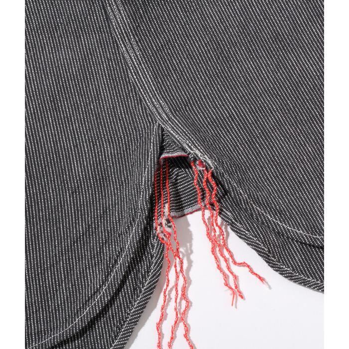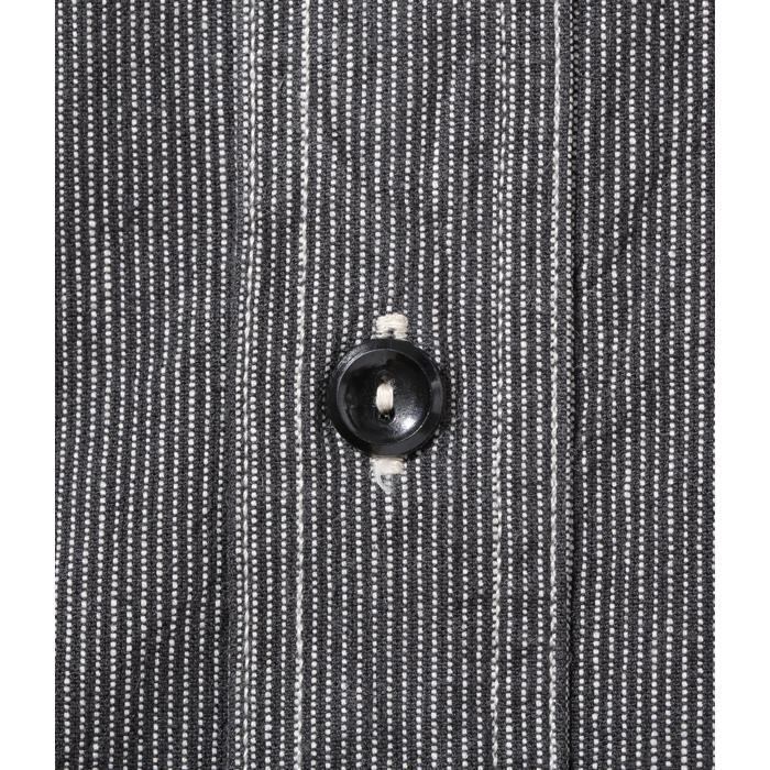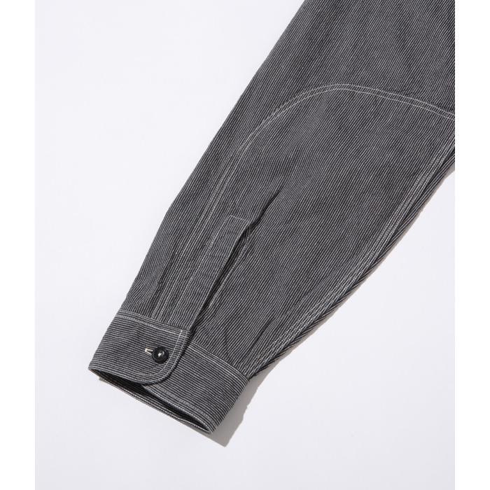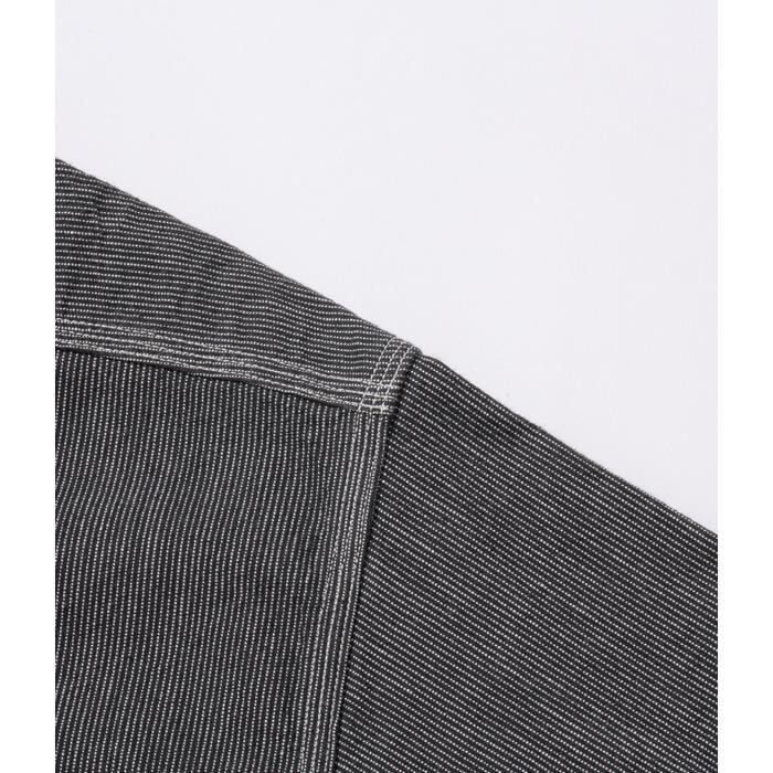 太番手の色糸を引きそろえて織り上げたジーンコード(コードストライプ)生地のワークシャツ。 生地感は若干硬めで、しっかりとした仕上がり。 肘の生地を二重にして強度を高めたダブルエルボー仕様など、ワークウエアならではのディテールが特徴。