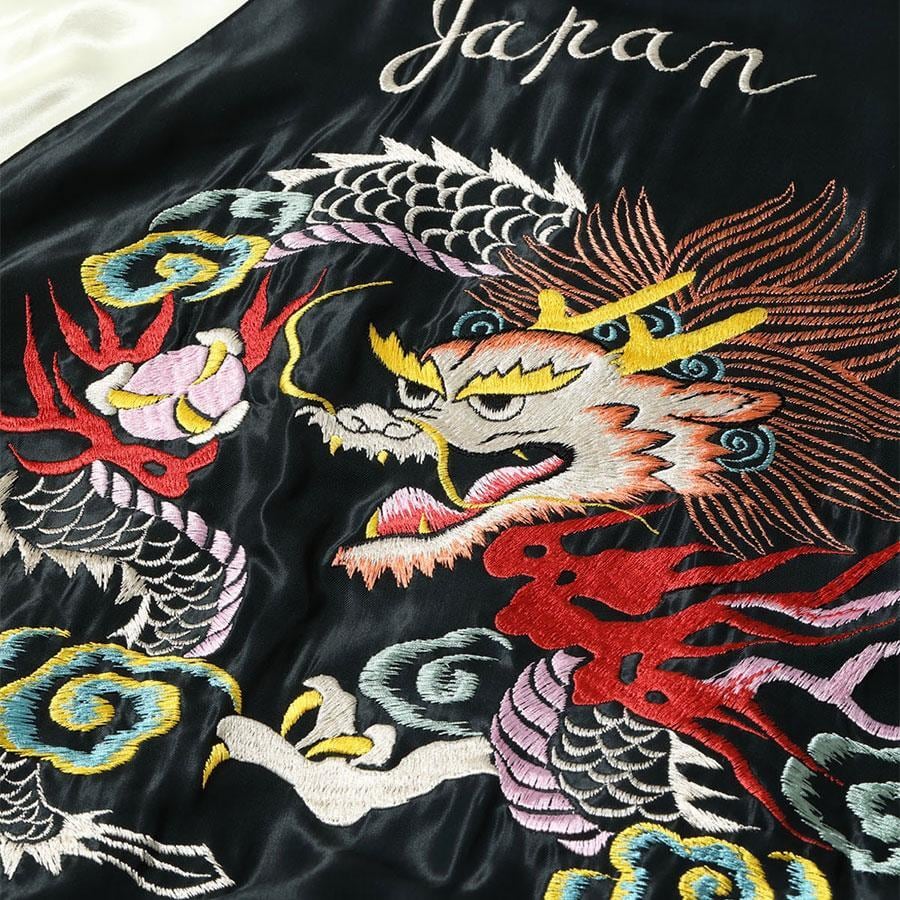 表面は鮮やかな色糸を駆使して描かれた白龍の絵柄。ブラックのサテン生地に炎のレッドや鬣(たてがみ)のオレンジが映えるが、それぞれの色糸を見ると実はビビッドな色味ではなく、日本古来の上品で淡い色合いを再現している。