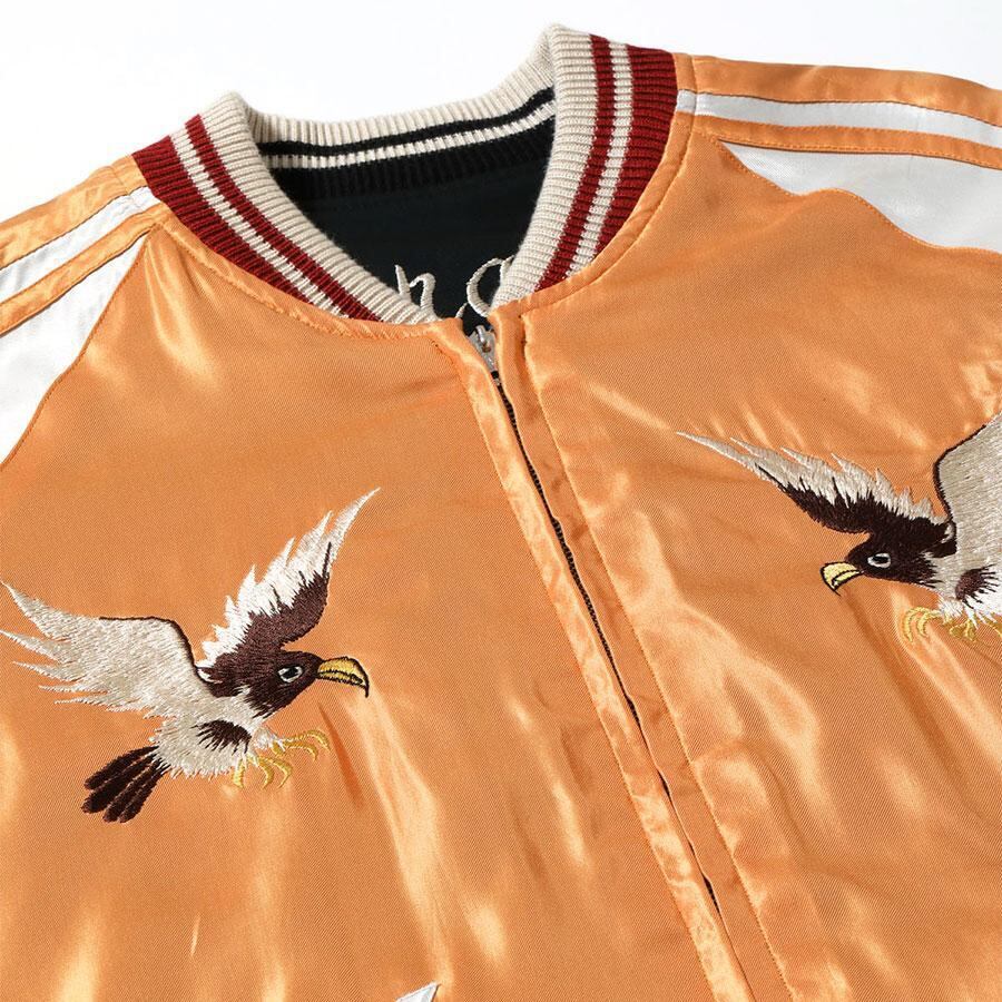 リバーシブル面は松の枝にとまり翼を広げるブラウン、シルバー、ホワイトのグラデーションで見事に描写した鷲の絵柄。非常に珍しいオレンジ色のボディに、淡いグリーンと濃いグリーンの色糸で描かれた松の葉が映える。ヴィンテージでは珍しい表面裏面ともに袖山のラインが3本となっているのが特徴。