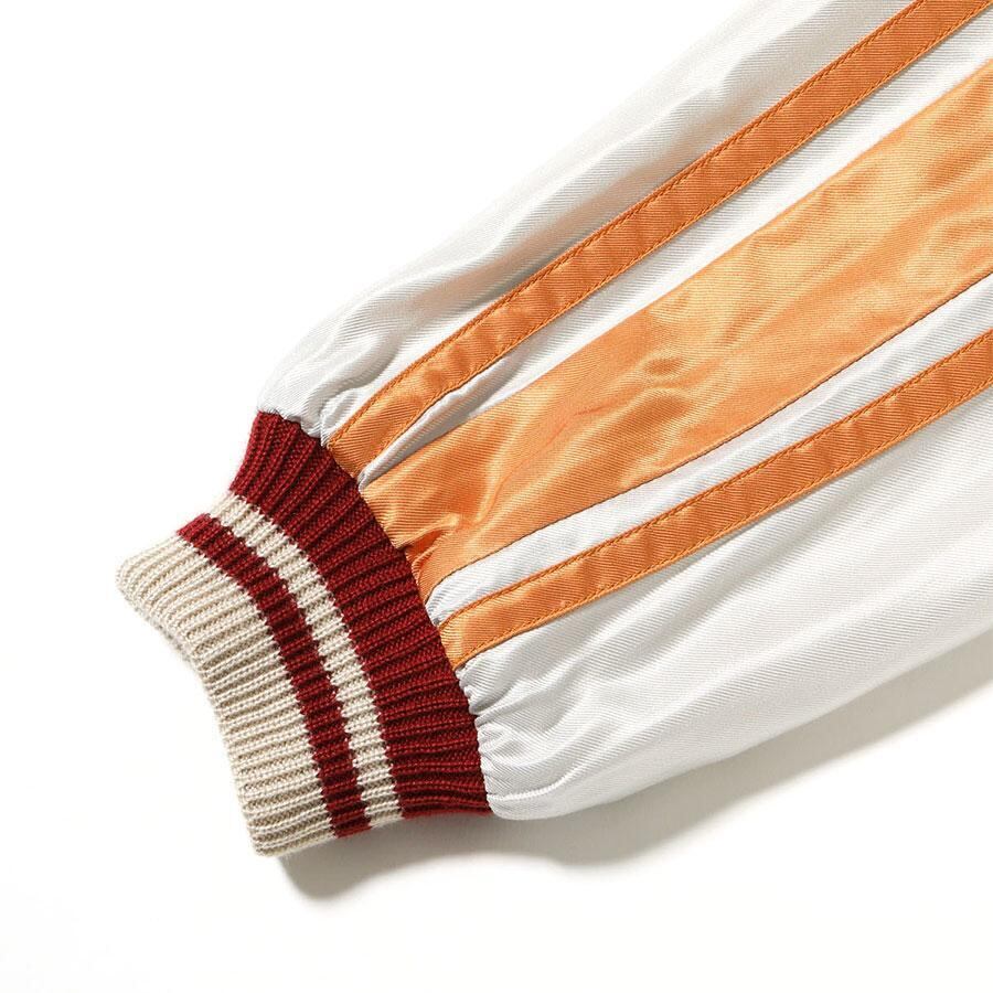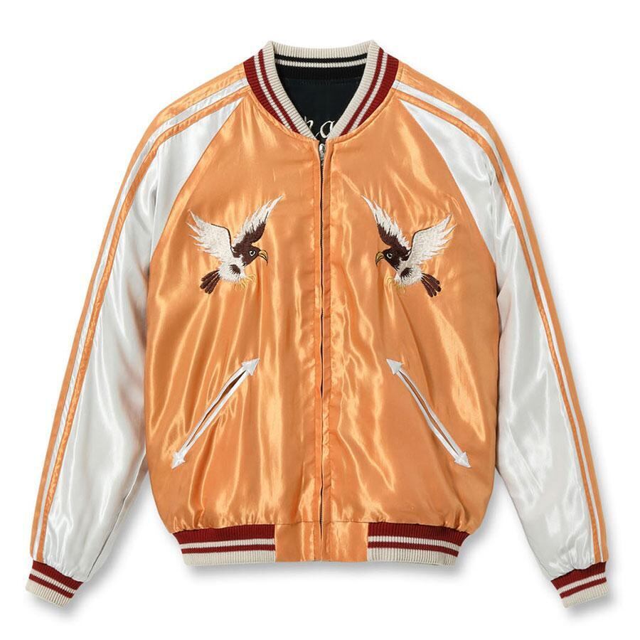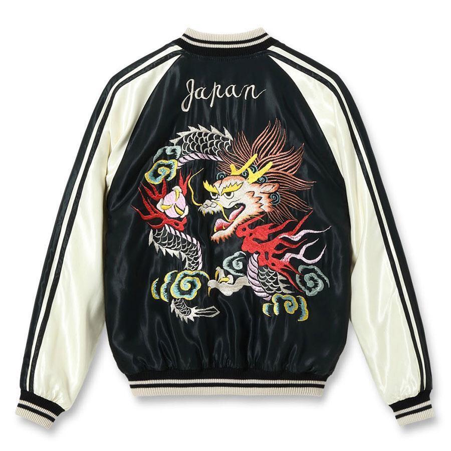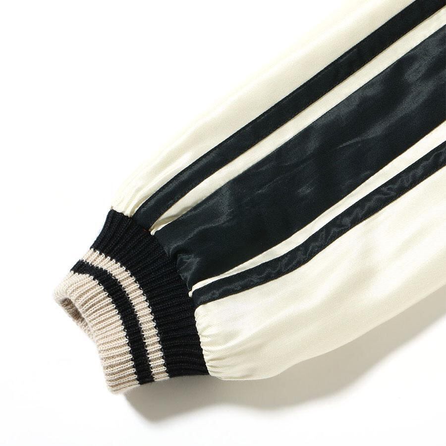 スーベニアジャケットのなかで最もスタンダードな両面にアセテート生地を使ったリバーシブルタイプ。戦後当時のスカジャンには、シルクに似た高級感を持つ物資統制外品目のアセテートが使われていた。中綿がないため季節を問わず着用でき、独特なドレープ感も魅力といえる。