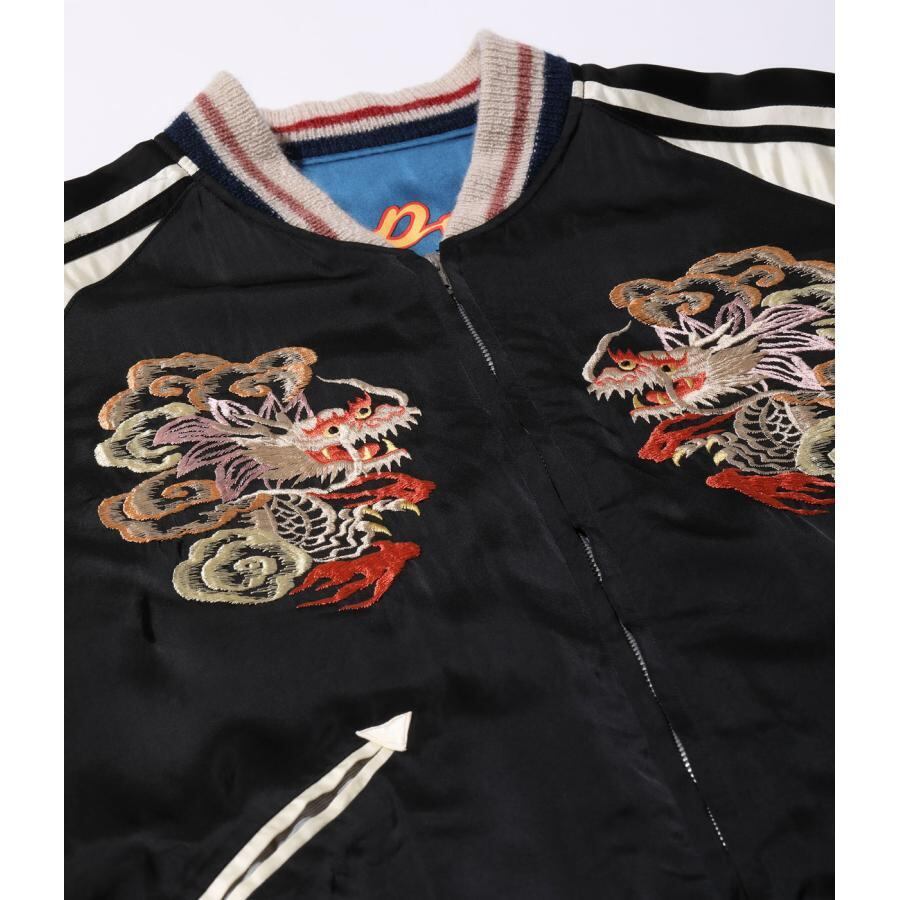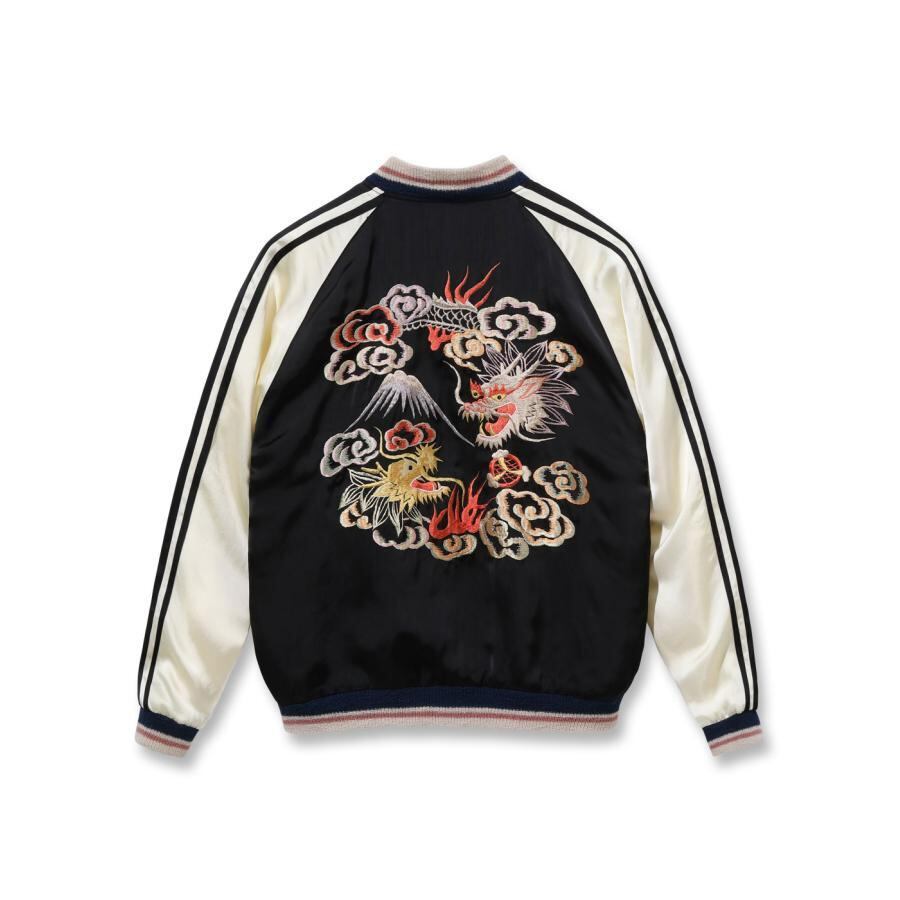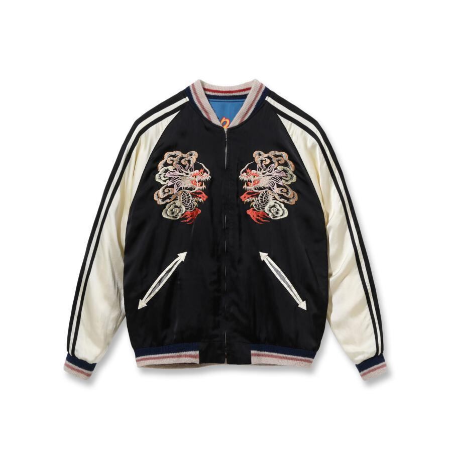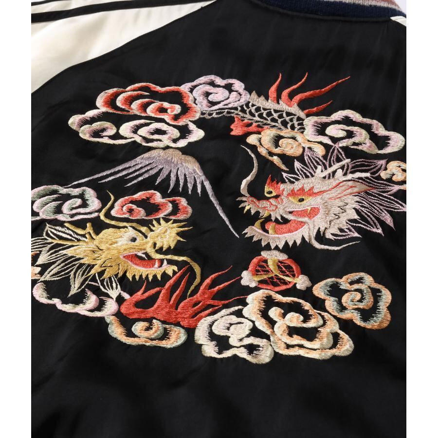 表面は富士山を挟んで睨み合う双龍の刺繍。絵柄を刺繍で埋めず、地となるアセテート生地のブラックを効果的に使い、繊細な配色の色糸で描いた龍が際立つよう計算された作り。当時の資料を紐解くと熟練の和装刺繍の職人が手がけたものであることがわかり、日本画を見ているかのような威厳ある仕上がりとなっている。通常よりも大きな胸の龍の刺繍、袖の3本ラインなど、もとにしたヴィンテージの仕様を再現した。
