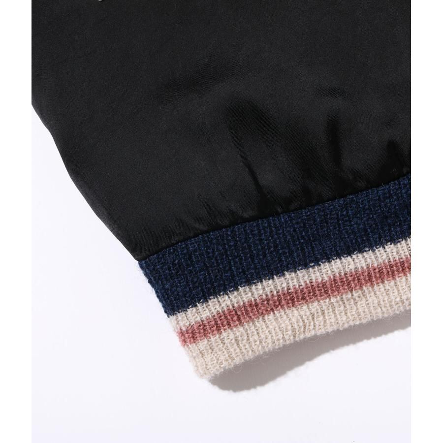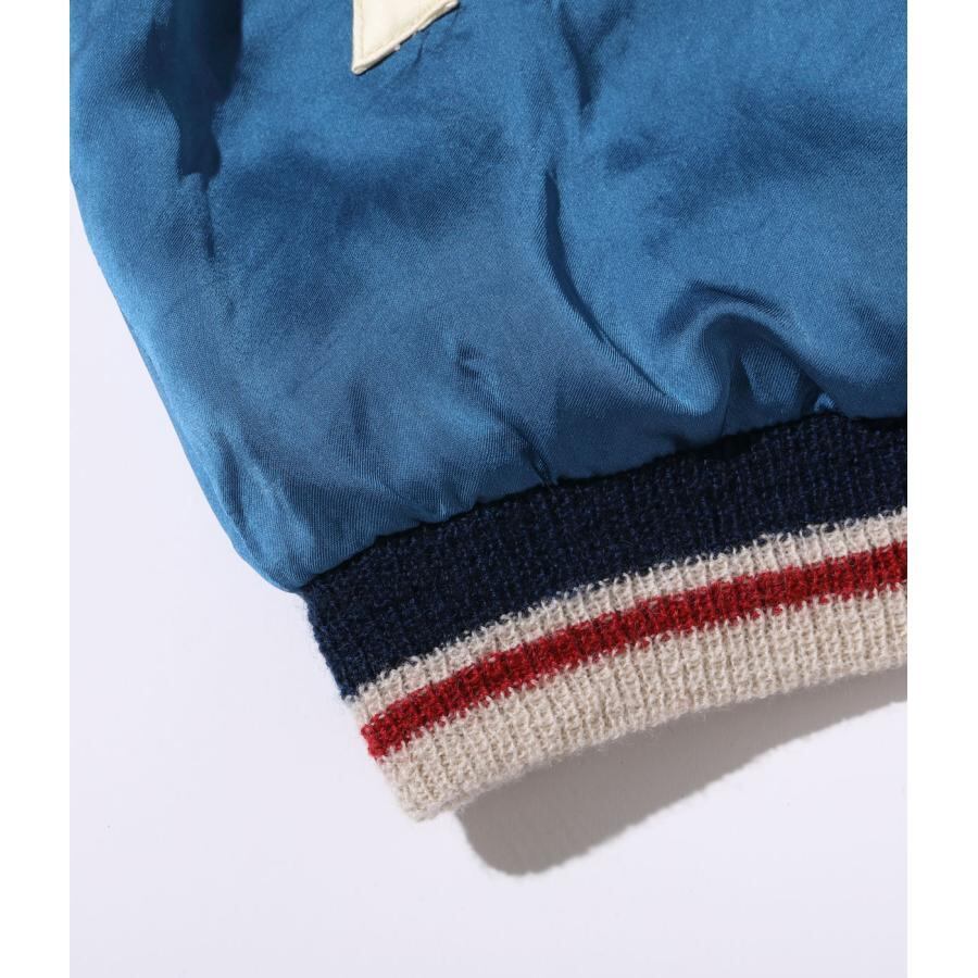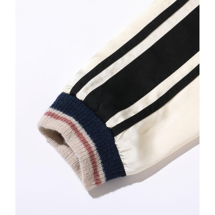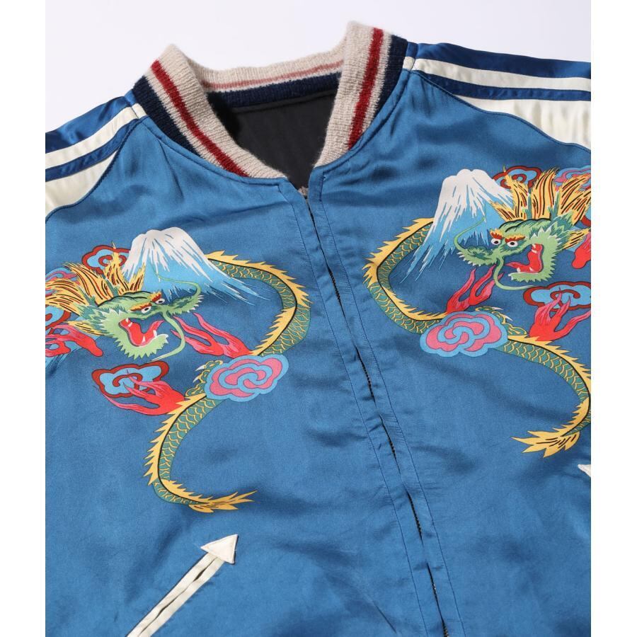 表面は富士山を挟んで睨み合う双龍の刺繍。絵柄を刺繍で埋めず、地となるアセテート生地のブラックを効果的に使い、繊細な配色の色糸で描いた龍が際立つよう計算された作り。当時の資料を紐解くと熟練の和装刺繍の職人が手がけたものであることがわかり、日本画を見ているかのような威厳ある仕上がりとなっている。通常よりも大きな胸の龍の刺繍、袖の3本ラインなど、もとにしたヴィンテージの仕様を再現した。
