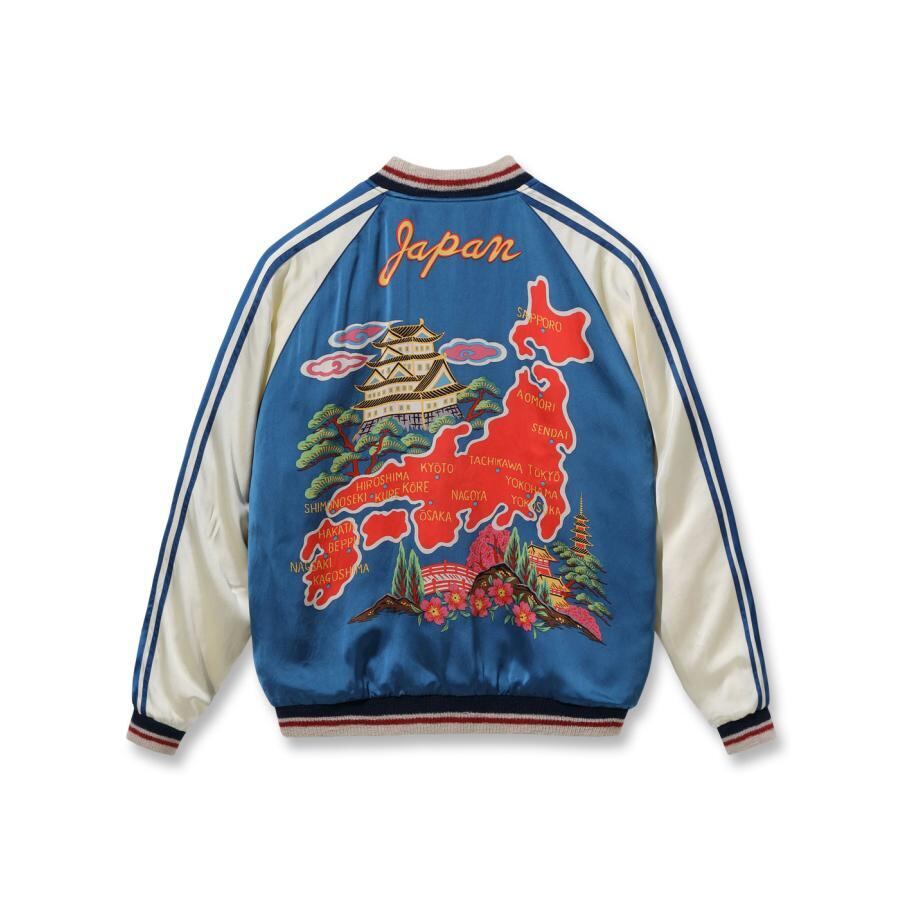 リバーシブル面はプリントのジャパンマップ柄。近代的な機械のプリントではなく、1色ずつ版を作り、その版を手作業で摺り重ねていく手捺染(ハンドプリント)によるもので、手間と時間、そして高度な技術を要するため当時の生産も極少数。しかも日本地図とともに城や風景が描かれたこの絵柄はプリントのスカジャンの中でも特にレアで、ヴィンテージ市場では入手不可能と言っても過言ではない。胸の龍は刺繍のスカジャンではありえない大きさで描かれており、その絵柄の迫力とヴィンテージの希少さから今回、辰年のスペシャルエディションとして復刻を果たした。