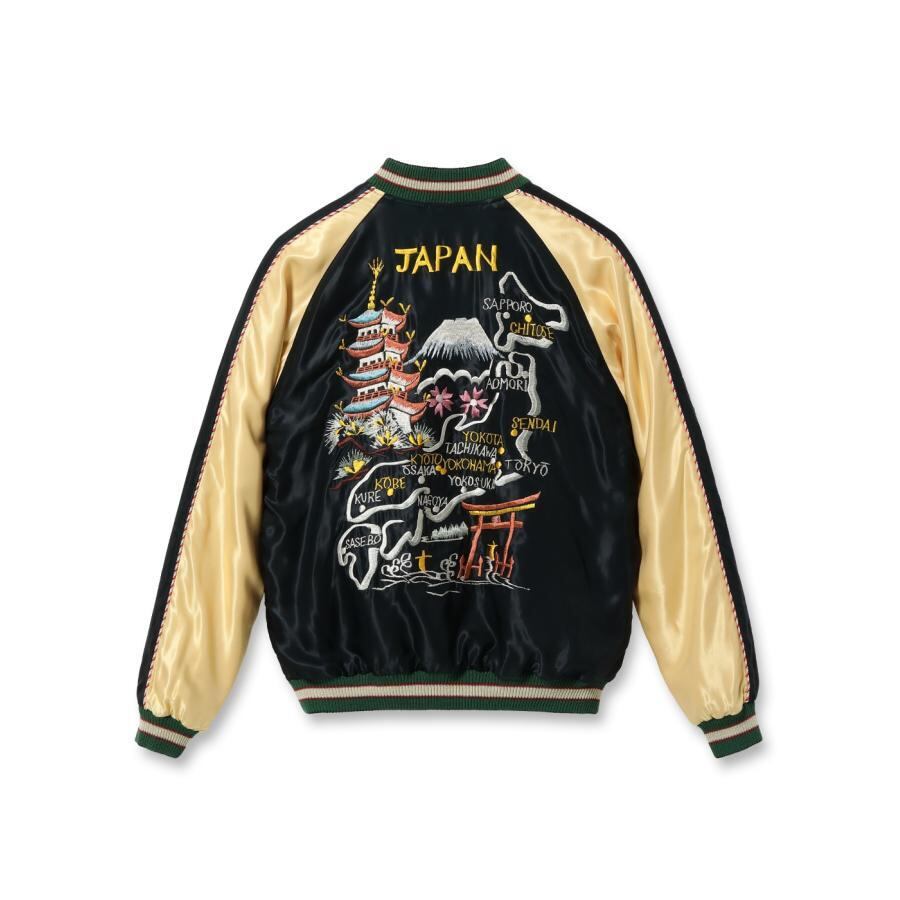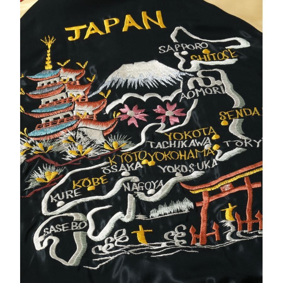 表面は富士山に五重塔、桜や松、鳥居など日本の美しい風景が凝縮されたジャパンマップ柄。1950年代初期のヴィンテージを再現したもので、無地場が少なく背中全面が刺繍で埋め尽くされた豪華な仕様が特徴。ブラックのボディに対して白を基調とした日本地図やモチーフのカラフルな色糸が映え、グリーンのリブや赤×白のロープパイピングがアクセントとなった秀逸な1着。