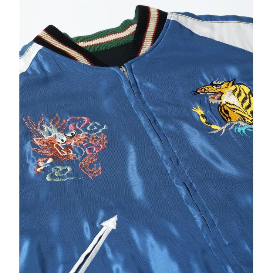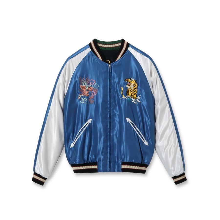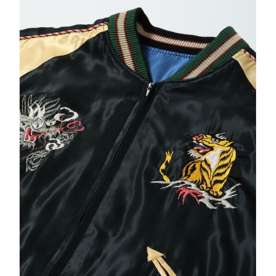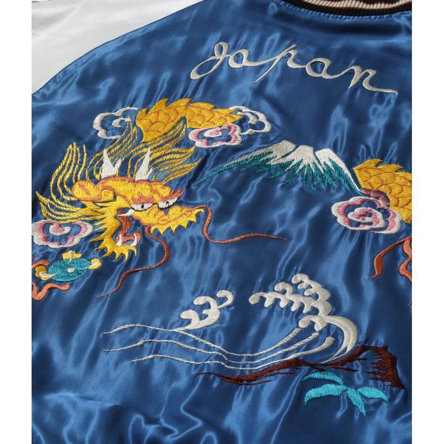 リバーシブル面は晴天を想わせるブルーのボディに金龍が舞う壮大な図案。表面とは対照的に余白を上手く使った絶妙なバランスの刺繍が特徴。胸の龍虎は表面と同じ絵柄だが、よく見ると色糸の使い方が異なっている。これはヴィンテージが両面とも同じ「刺繍型」を使って作られていたためで、同じ絵柄でも生地の色に合わせて色味を変える当時の刺繍職人のこだわりがうかがえる。