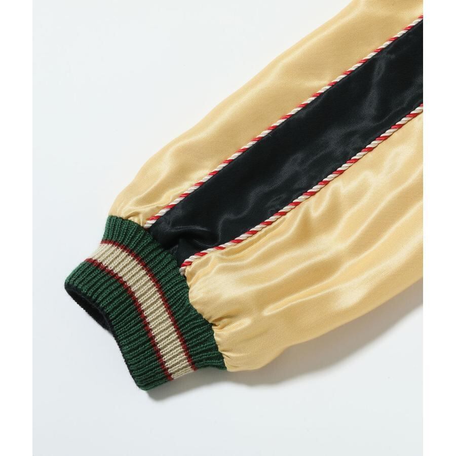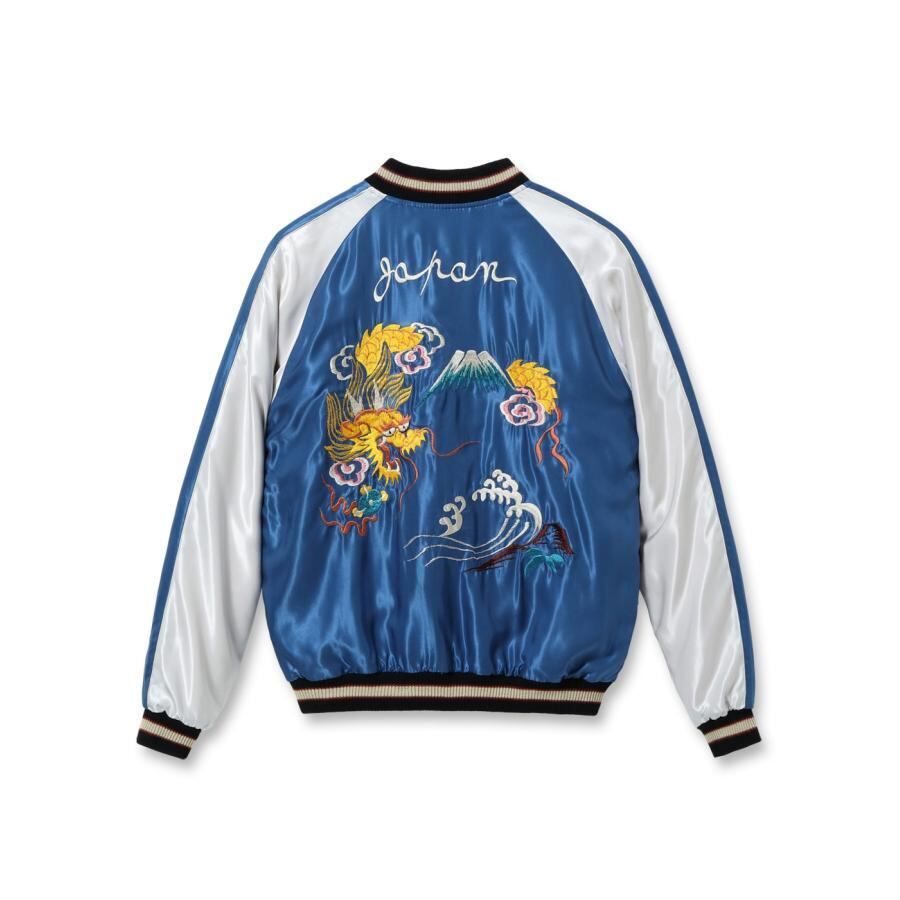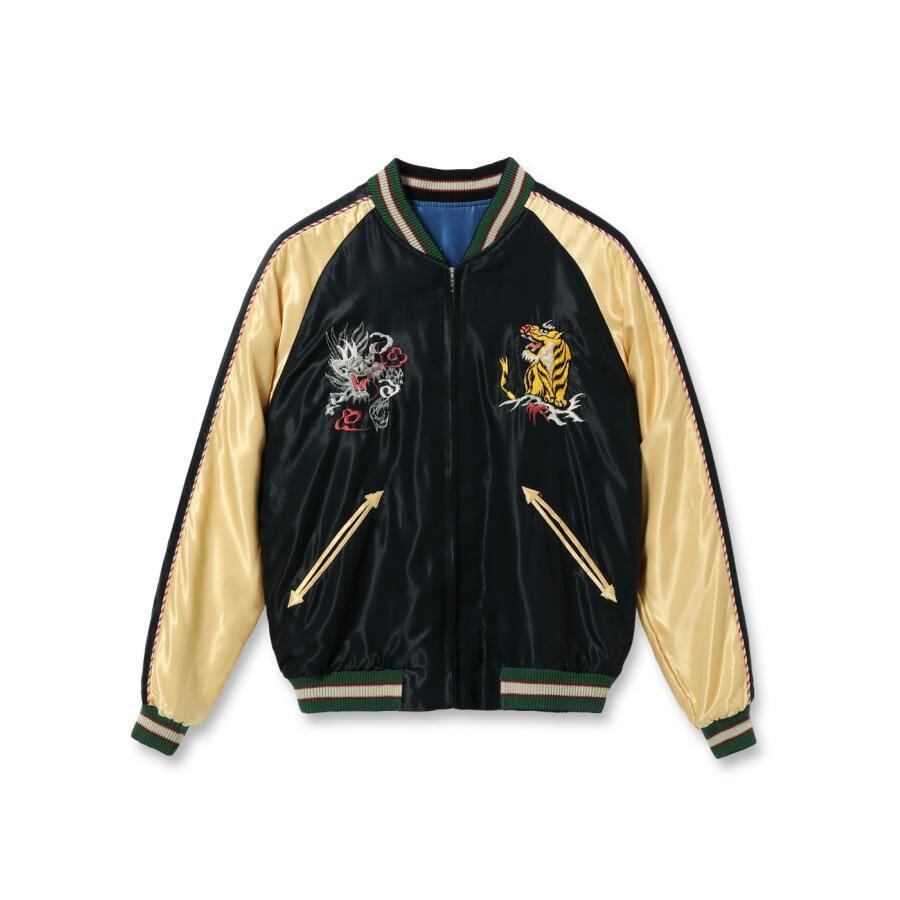 スーベニアジャケットのなかで最もスタンダードな両面にアセテート生地を使ったリバーシブルタイプ。戦後当時のスカジャンには、シルクに似た高級感を持つ物資統制外品目のアセテートが使われていた。中綿がないため季節を問わず着用でき、独特なドレープ感も魅力といえる。