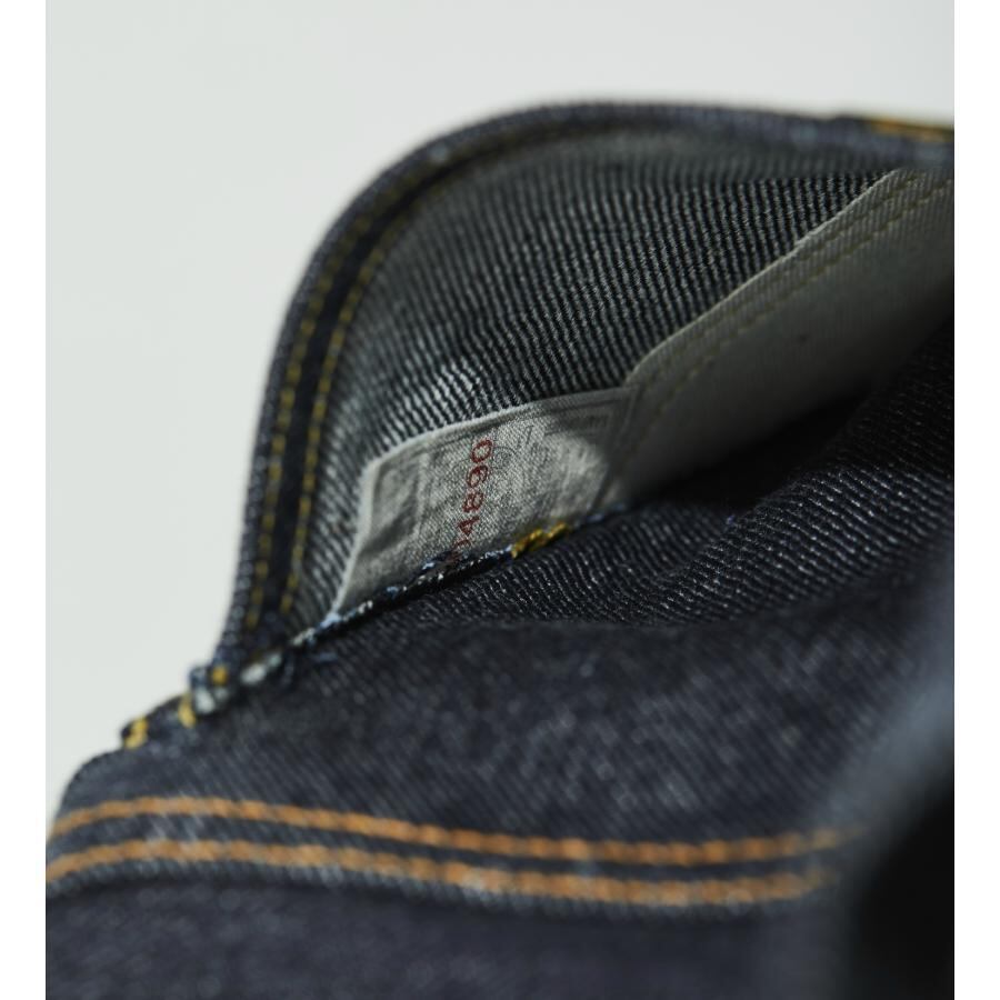 サイドに移動した黒タグ、〓付きのHPL(ヒップ・ポケット・レーベル)、磨かれた美しいシルエットは現代の着こなしにもマッチする。