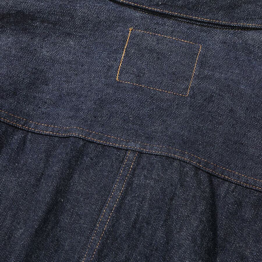 フロントや袖口のタックボタンが、パンツのフライ用のスモールボタンからトップ用のフルサイズに変わって間もない時代の1936年モデル・デニムブラウス。戦前らしいオレンジがメインのステッチワークが映えている。前身頃の身返し端にはセルビッジが見られる。デニムの生地幅の都合上、サイズ46以上の背中はEXTRA SIZEであるT-BACK仕様となる。