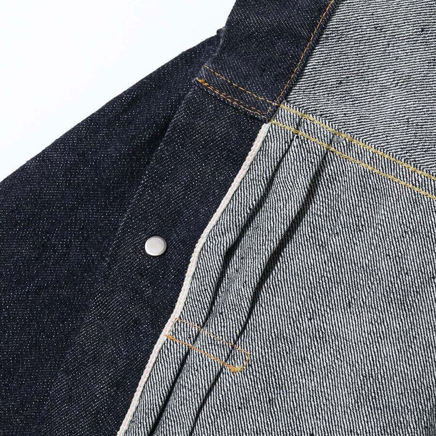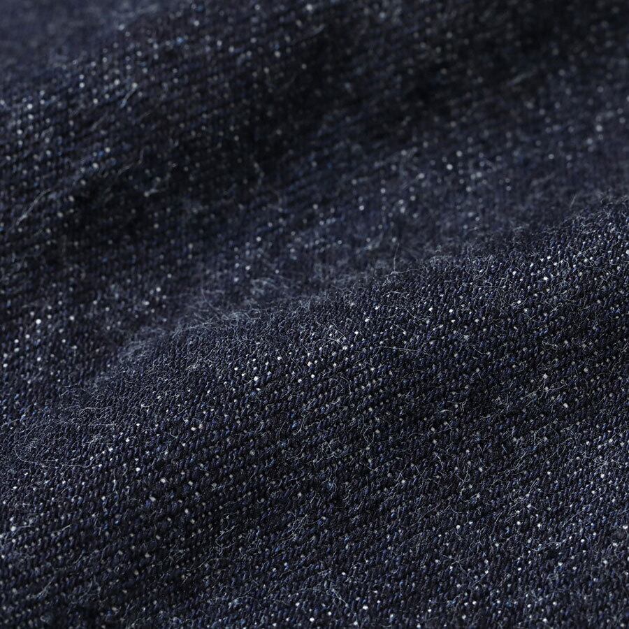 フロントや袖口のタックボタンが、パンツのフライ用のスモールボタンからトップ用のフルサイズに変わって間もない時代の1936年モデル・デニムブラウス。経糸7番×緯糸7番の未熟な紡績のムラ糸を使用した13.5oz.セルビッジデニムに、戦前らしいオレンジがメインのステッチワークが映えている。左胸ポケットのフラップの裏側にはライトオンスデニムを使用し、前身頃の身返し端にはセルビッジが見られる。