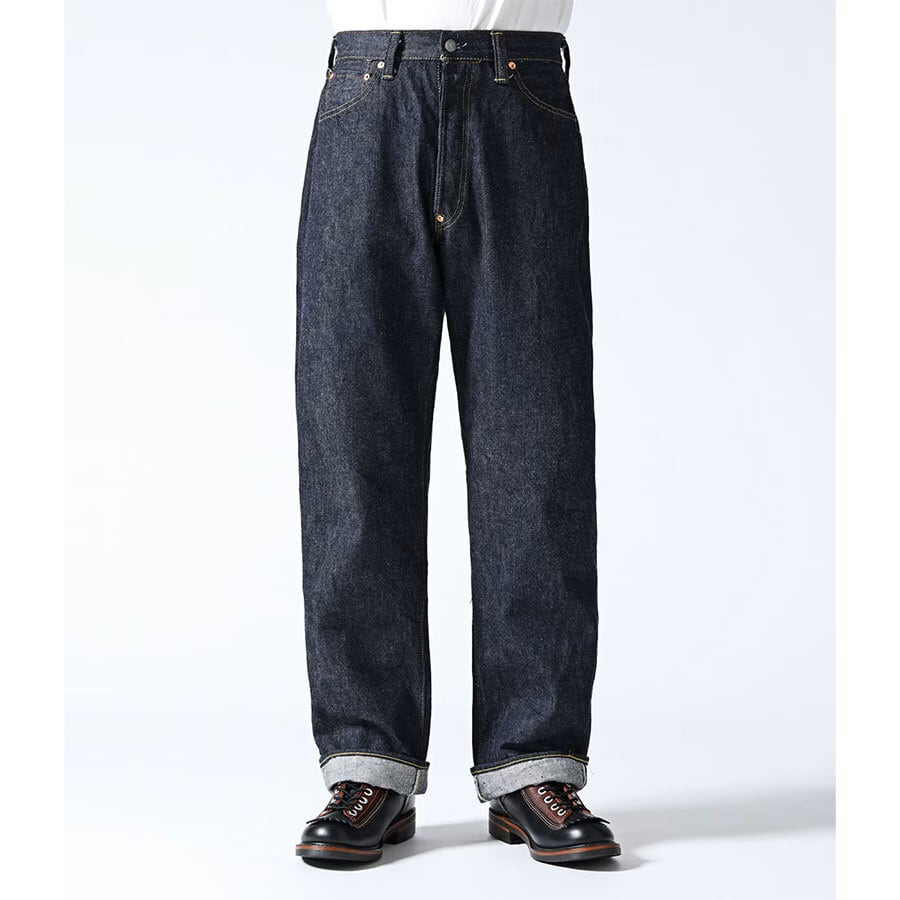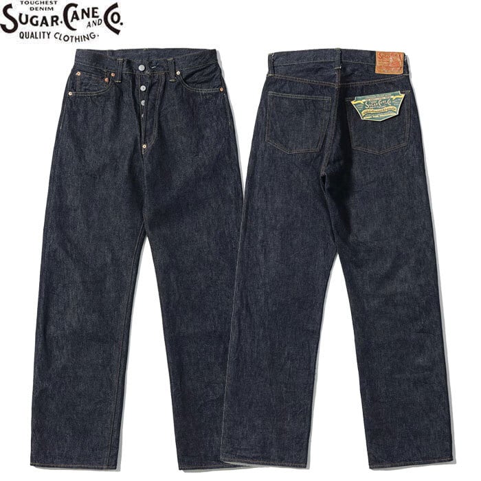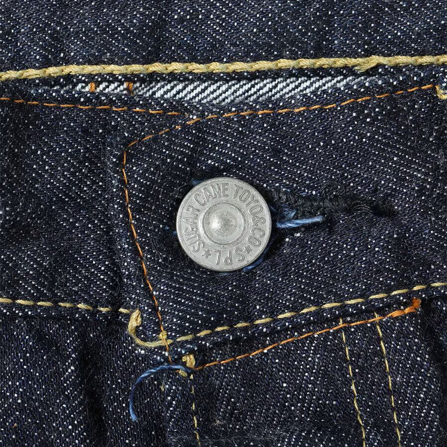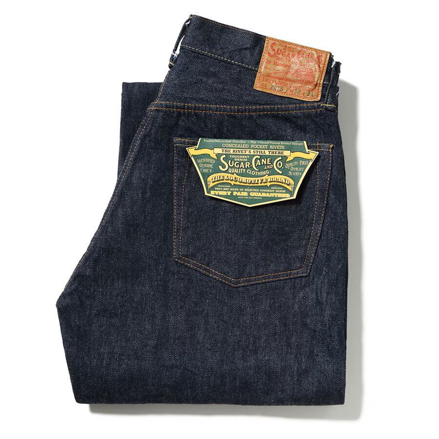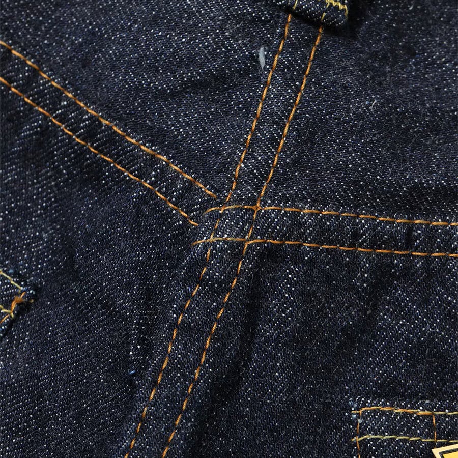 1936年モデルのウエストオーバーオールズをベースに、腿から裾までをワークパンツのように太めにアレンジした「2025年モデル」。サスペンダー用ボタンやシンチバックがはシュガーケーンオリジナルの仕様として排除している。しかし股リベットや後中心の巻き縫いの方向(右高)は戦前モデルの仕様を踏襲。