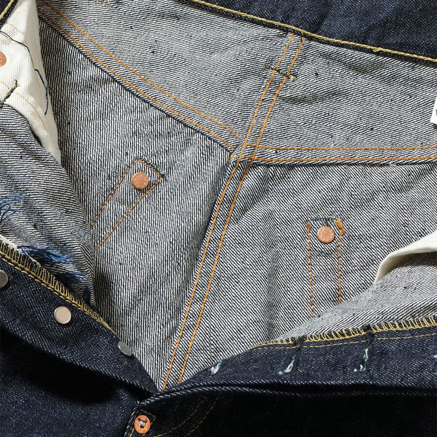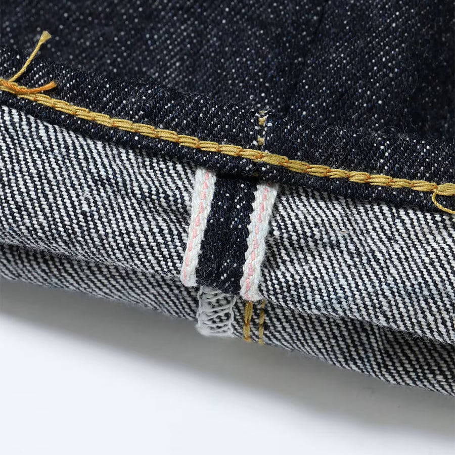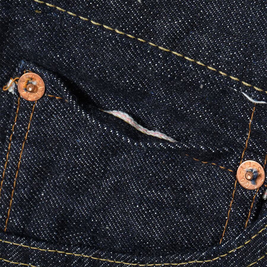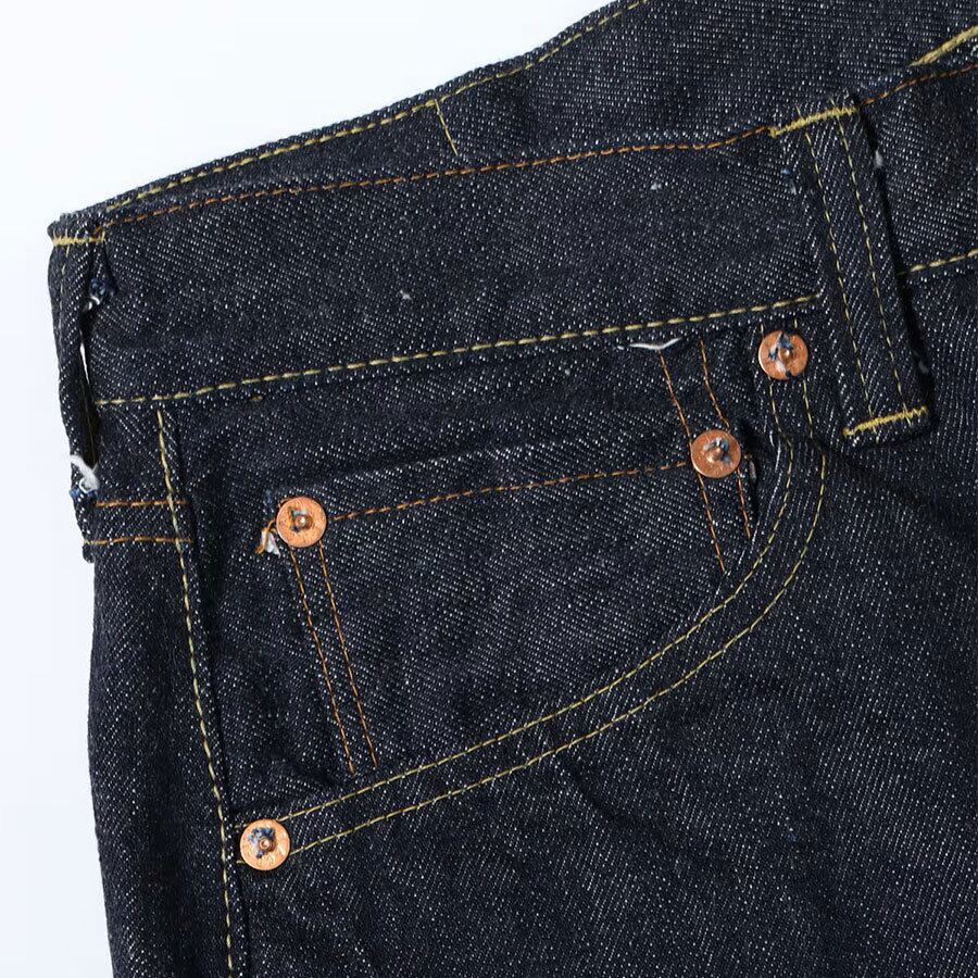 1936年モデルのウエストオーバーオールズをベースに、腿から裾までをワークパンツのように太めにアレンジした「2025年モデル」。サスペンダー用ボタンやシンチバックがはシュガーケーンオリジナルの仕様として排除している。しかし股リベットや後中心の巻き縫いの方向(右高)は戦前モデルの仕様を踏襲。