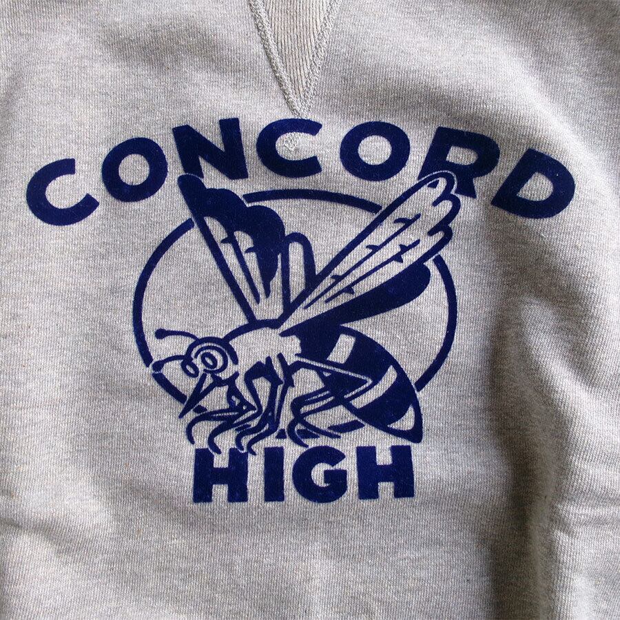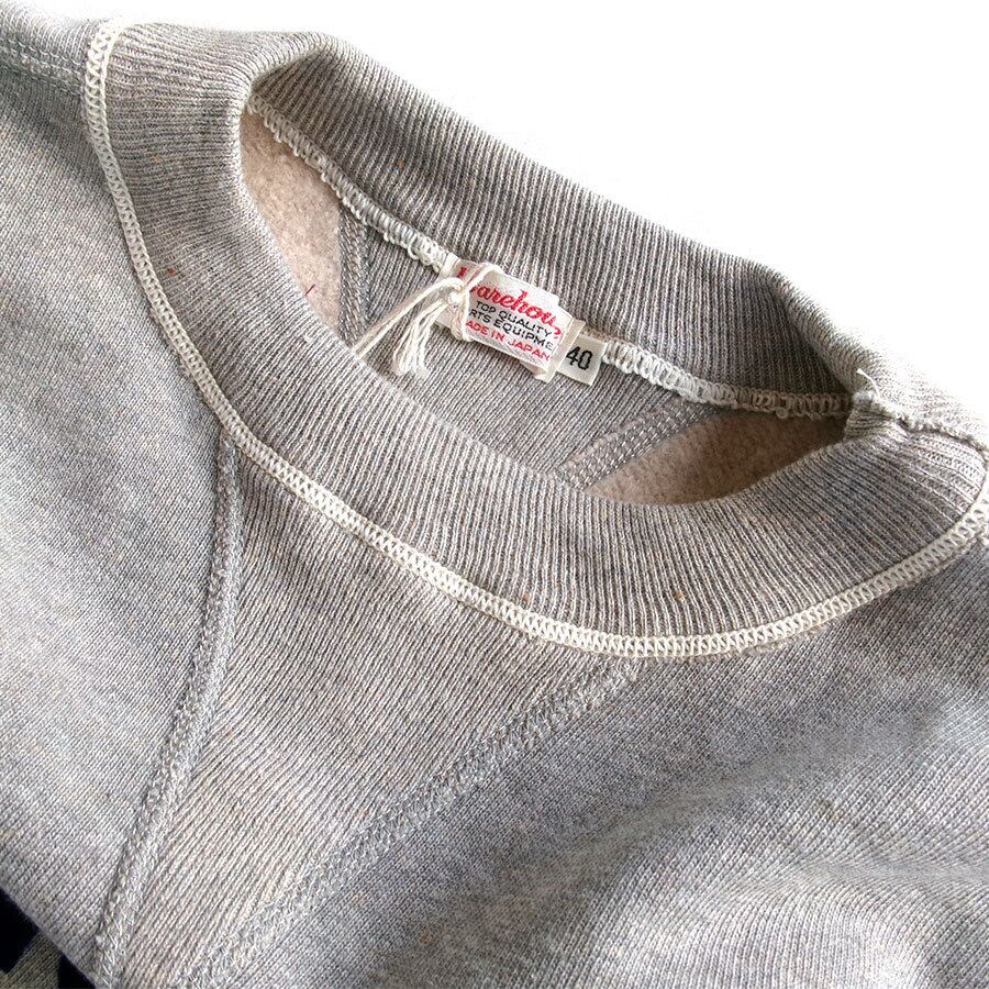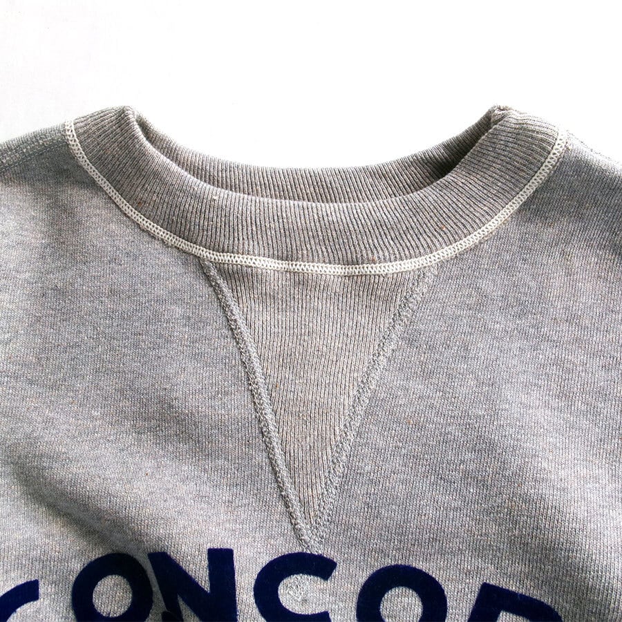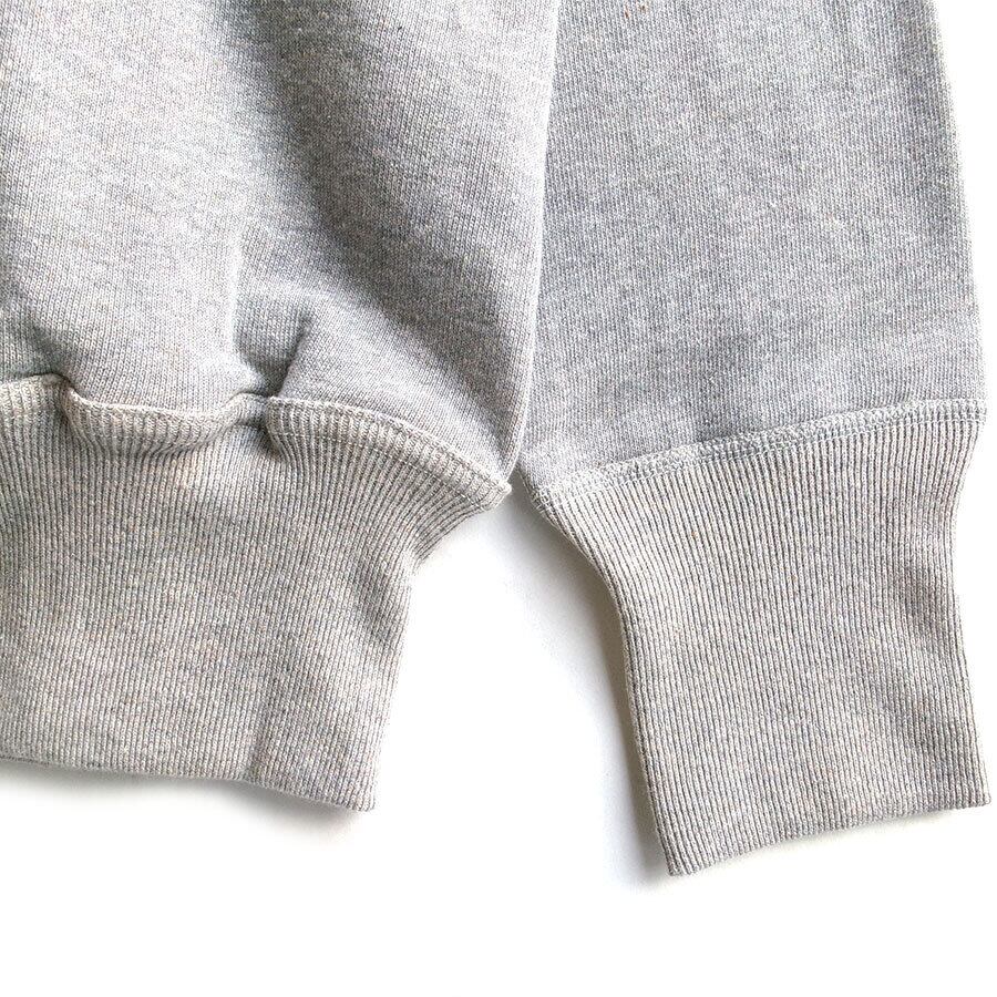 カットソーがウールからコットンに変わった1930年代からある挟み込み仕様の腰リブ。首まわりには伸縮に富むV字のフライスを前後に配した四本針仕様のスウェットです。肩口から垂直に落ちる袖口のセットインスリーブはややソリッドな印象を受けるシンプルなデザインですが、腰帯のバインダー仕様は着込むほどにアタリが生まれます。