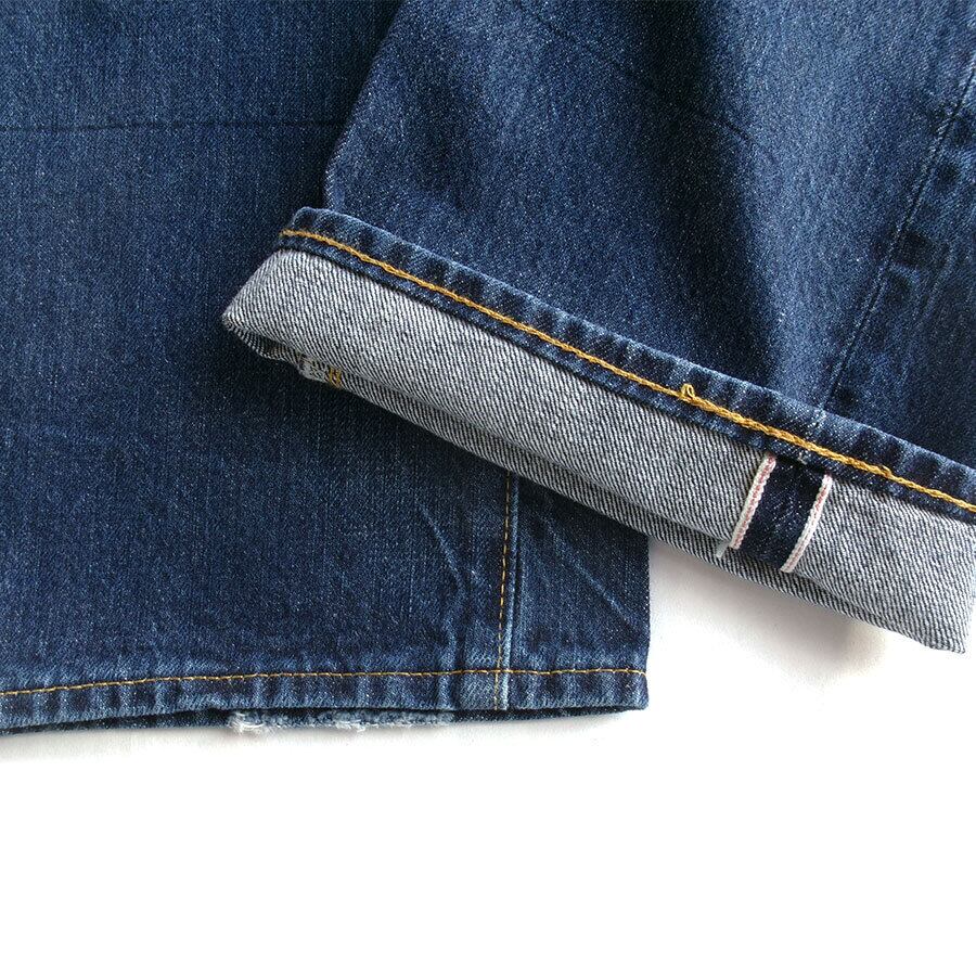 加工感は勿論、ダイヤポイントのアーキュエットステッチや、BIG Eのレッドタブ、打ち抜きリベット、コインポケットには赤耳、レザーパッチは牛革仕様等、コーンミルズ社製デニムを使ったLVCの拘りが詰まった一本です。