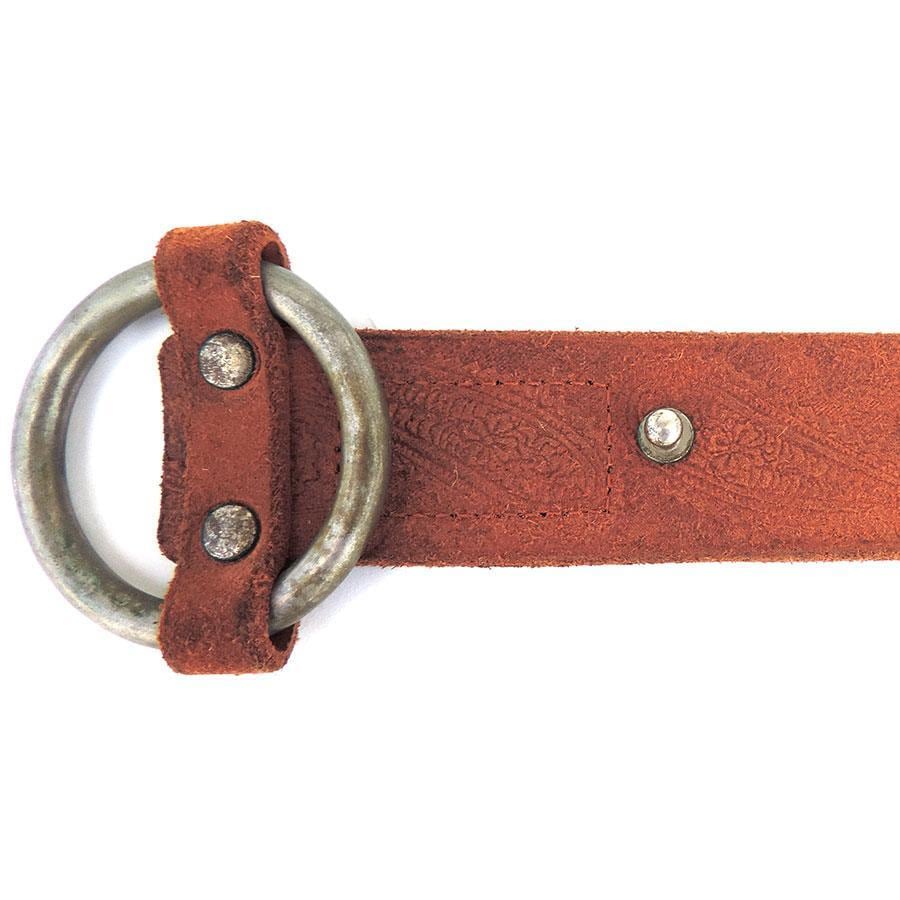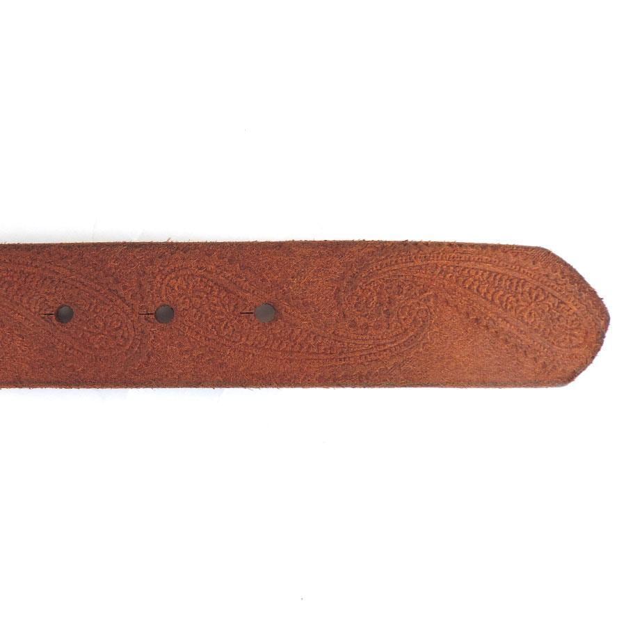 しっかりとした肉厚な牛革を裏使いしペイズリーの型押しを施したリングタイプのベルトです。